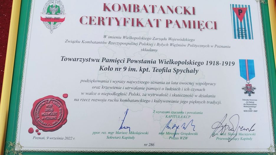Podczas uroczystości inny z wnuków, Piotr Jan Toboła odznaczony został Odznaką Honorową TPPW „Wierni pamięci” a Koło nr 9 TPPW im. kpt Teofila Spychały w Pile uhonorowane zostało „Kombatanckim Certyfikatem Pamięci” – oba odznaczenia wręczył Mirosław Grzędowski, prezes Wielkopolskiego Zarządu Wojewódzkiego Związku Kombatantów Rzeczpospolitej Polskiej i Byłych Więźniów Politycznych w Poznaniu a zarazem członek założyciel Towarzystwa Pamięci Powstania Wielkopolskiego 1918/1919.