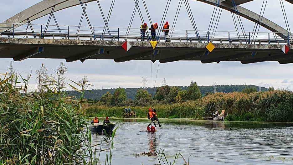 W kolejnej części szkolenia zostało zrealizowane założenie dotarcia do osoby poszkodowanej z wykorzystaniem technik ratownictwa wysokościowego, poprzez opuszczenie z mostu zabezpieczonego w specjalistyczny sprzęt ratownika.