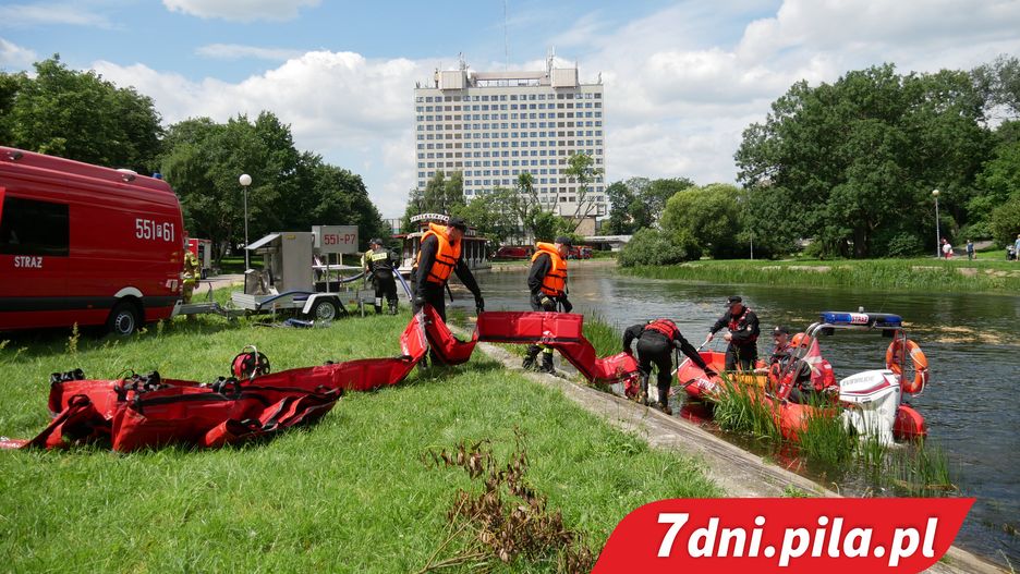 Na szczęście nie była to prawdziwa akcja, tylko symulacja i ćwiczenia strażaków dwóch specjalistycznych grup z pilskiej komendy straży pożarnej, Grupy Ratownictwa Chemiczno-Ekologicznego oraz Grupy Ratownictwa Wodno-Nurkowego.