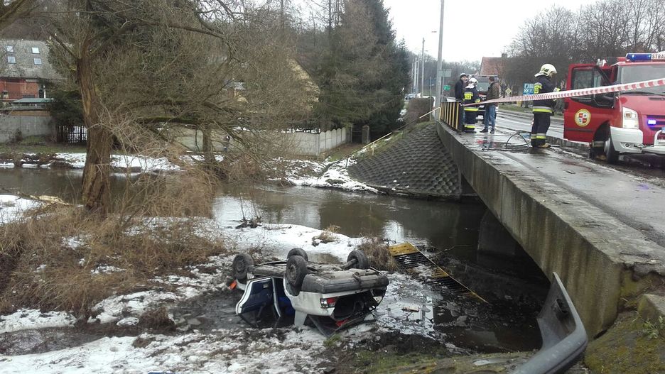 Auto spadło z mostu na brzeg rzeki