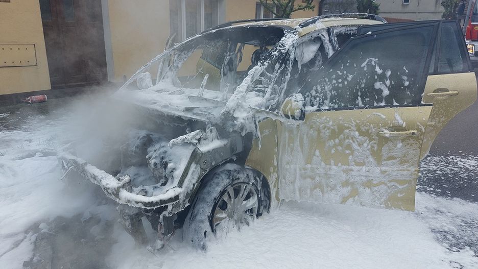 Działania straży pożarnej w pierwszej kolejności polegały na zabezpieczeniu miejsca zdarzenia i podaniu jednego prądu piany ciężkiej w natarciu na palący się samochód.