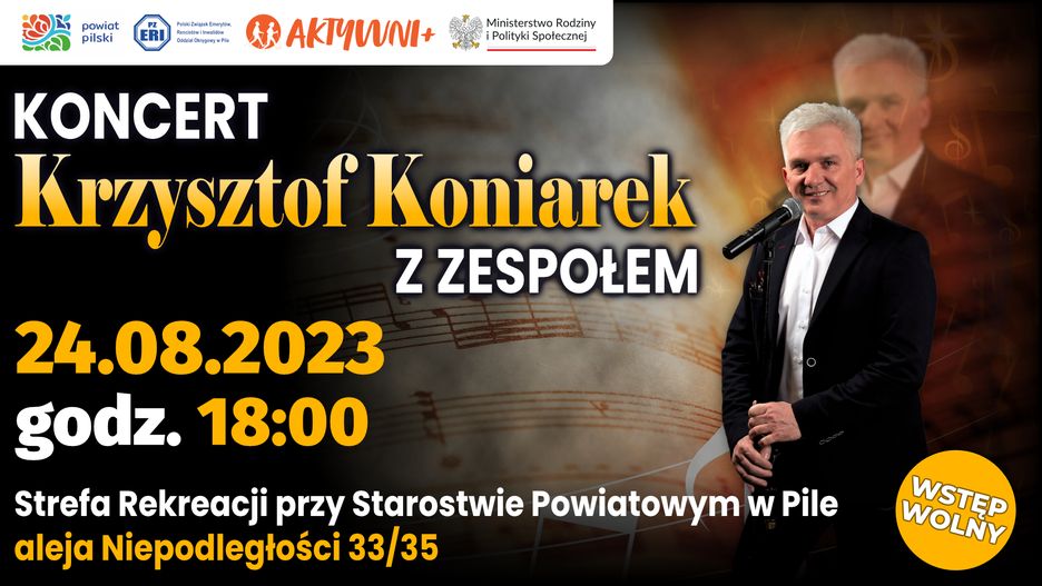 Koncert Krzysztofa Koniarka odbędzie się w ramach programu „AKTYWNY SENIOR W POWIECIE PILSKIM” realizowanego przez Oddział Okręgowy Polskiego Związku Emerytów Rencistów i Inwalidów w Pile, dofinansowanego przez Ministerstwo Rodziny i Polityki Społecznej.