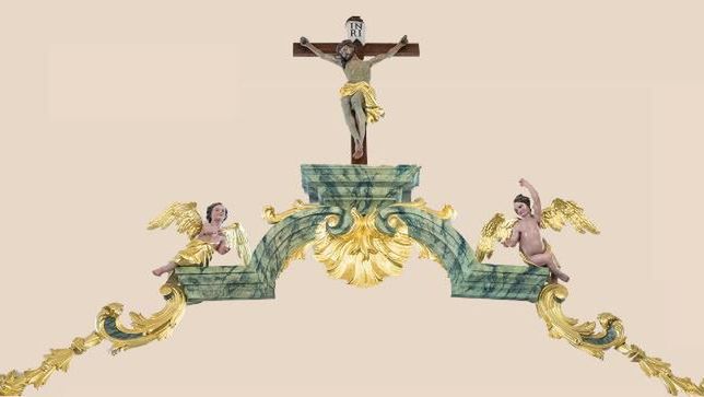 Wyposażenie kościoła wyróżnia się wysokiej klasy wykonawstwem, bogactwem form, wyszukanymi pozami rzeźb i wyraźną ekspresją. Przepych, iluzja, teatralizacja i wielopłaszczyznowość przedstawienia sprawiają, że wierny wchodzący do świątyni zostaje przeniesiony do Niebieskiego Jeruzalem. Na szczególną uwagę zasługuje ozdobna belka tęczowa. Nazwa jej wywodzi się od symbolicznego znaczenia tęczy, która łączy niebiosa i ziemię. Znajduje się pod sklepieniem, na połączeniu nawy z prezbiterium. Umieszczano na niej Ukrzyżowanego Chrystusa. Belka tęczowa wraz z krucyfiksem symbolizują chrześcijańską prawdę, że poprzez Męczeństwo Chrystusa można osiągnąć zbawienie.