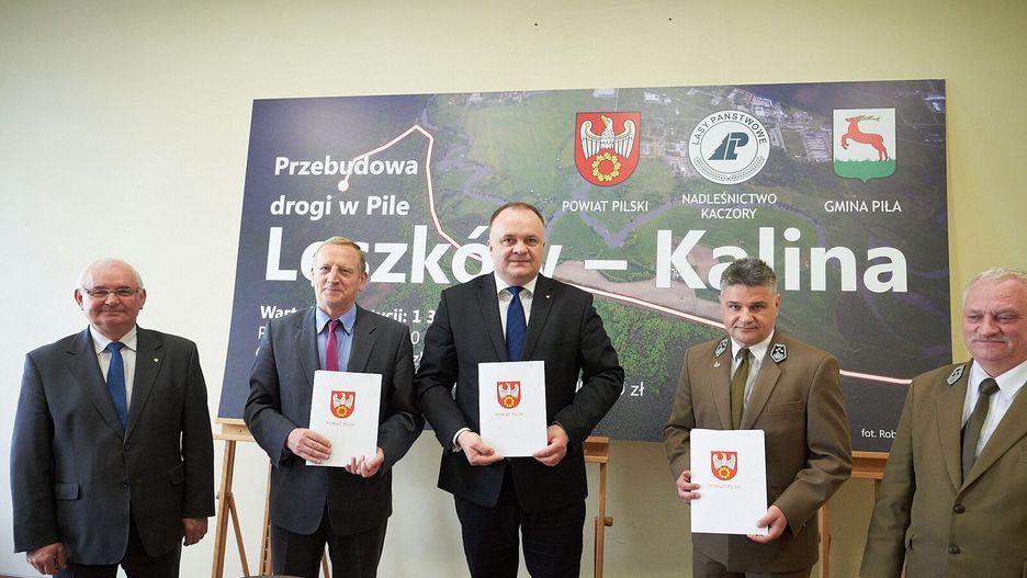 Wreszcie! Droga Piła – Kalina będzie wyremontowana. Doczekaliśmy się szczęśliwego finału prowadzonych od kilku miesięcy rozmów, dotyczących przebudowy drogi na odcinku Piła Leszków – Piła Kalina (3 290 metrów). W negocjacjach, prowadzonych z inicjatywy władz Powiatu Pilskiego, wzięły również udział władze Gminy Piła oraz Skarb Państwa, reprezentowany przez Państwowe Gospodarstwo Leśne Lasy Państwowe – Nadleśnictwo Kaczory. Trójstronną umowę podpisano w budynku Starostwa Powiatowego w Pile.