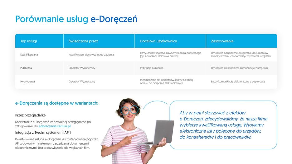 Na rynku e-Doręczeń dostępni są dostawcy oferujący usługi kwalifikowane. Usługi te są przeznaczone dla przedsiębiorców oraz osób fizycznych i spełniają wymogi ustawy o e-Doręczeniach.