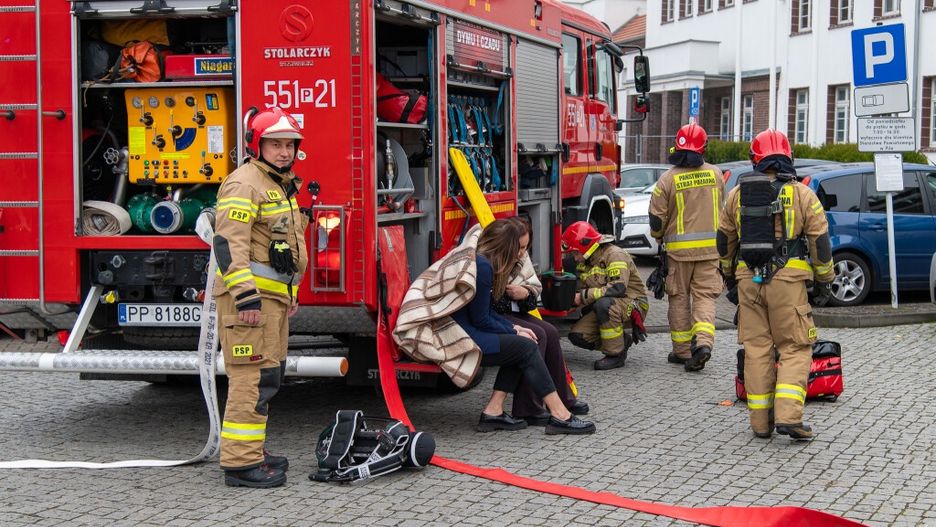 – Przyjęliśmy codzienny, realistyczny scenariusz, tak aby ćwiczenia odbyły się w naturalnych warunkach, z udziałem pracowników i petentów. Chodziło o sprawdzenie, jak reagują osoby znajdujące się w budynku oraz jak przebiega współpraca ze służbami ratunkowymi – podkreślił mł. bryg. Grzegorz Orłowski, kierownik ćwiczeń, dowódca JRG nr 1 KP PSP w Pile.