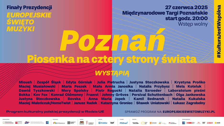Już 27 czerwca w pięciu miastach w Polsce odbędą się koncerty plenerowe pod wspólnym szyldem Europejskiego Święta Muzyki. W Poznaniu, Rzeszowie, Krakowie, Bydgoszczy i Gdańsku setki artystów zagrają wyjątkowy multikoncert, który zwieńczy Program kulturalny polskiej prezydencji w Radzie Unii Europejskiej. To wydarzenie, odbywające się w różnych częściach kraju, będzie nie tylko ukoronowaniem działań prowadzonych przez Narodowe Centrum Kultury od stycznia tego roku, lecz także symbolicznym momentem wspólnego świętowania europejskich wartości.