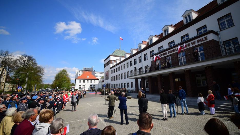 Uroczystość rozpoczęła się od podniesienia flagi na maszt, który został zamontowany na budynku Starostwa. To najwyższy punkt w Pile – stolicy powiatu pilskiego, na którym powiewa Biało-Czerwona.