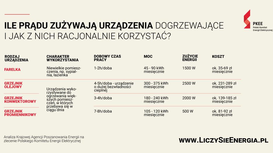 Krajowa Agencja Poszanowania Energii na zlecenie Polskiego Komitetu Energii Elektrycznej, przygotowała zestawienie najpopularniejszych urządzeń dogrzewających, uwzględniające ich parametry techniczne, a co najważniejsze – ich energochłonnoś