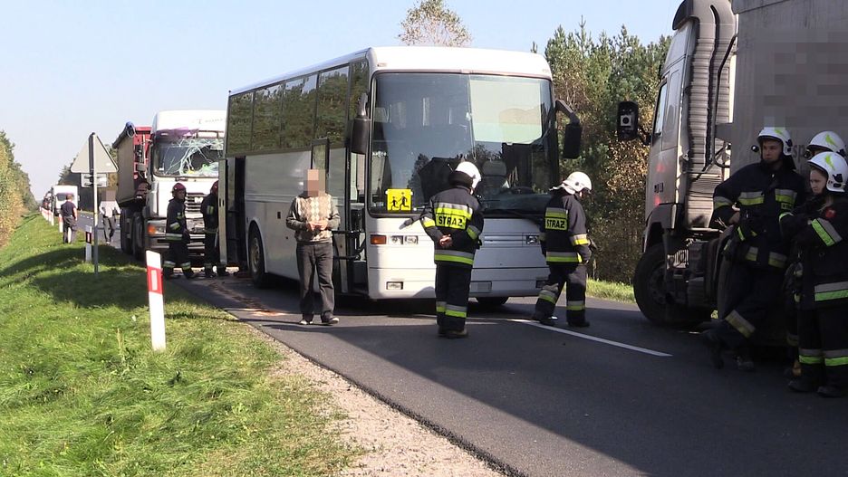 W wyniku wjechania ciężarówki w tył autokaru do szpitala trafiła dwójka dzieci. Pozostałe osoby czekały na poboczu drogi na inny transport. Kierowcy wszystkich pojazdów byli trzeźwi.