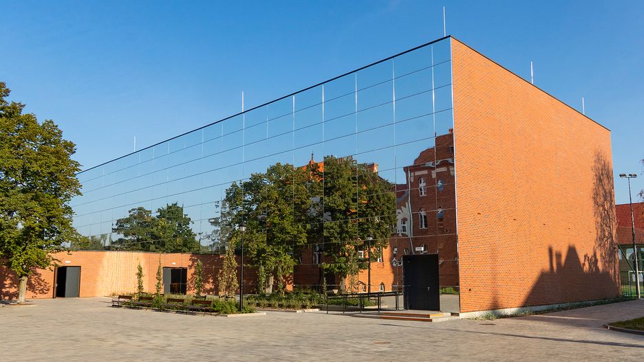 Część elewacji hali wyłożono czerwoną płytką klinkierową, natomiast jedna ze ścian została pokryta płytką lustrzaną, co sprawia, że historyczna bryła szkoły odbija się w nowoczesnym budynku. Ten efekt architektoniczny z pewnością przyciąga wzrok i dodaje wyjątkowego charakteru całemu kompleksowi.