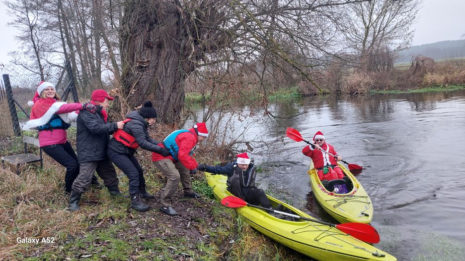 Na brzegu czekała radość, muzyka i mnóstwo świątecznych emocji. Główny Mikołaj, w towarzystwie pomocników, rozdawał dzieciom upominki, nie brakowało wspólnych pląsów, pamiątkowych zdjęć i gorącej czekolady, która rozgrzewała wszystkich mimo chłodnej aury. Po zakończonej zabawie kajakarze ruszyli dalej Gwdą w stronę Motylewa, a dzieci udały się na zajęcia prowadzone w ciepłej sali u Wyspiarza.