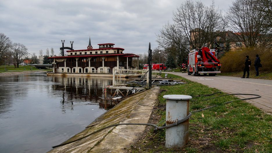 Wielka akcja pilskich strażaków na Gwdzie na wysokości Domu Pomocy Społecznej. Barka Missisipi odczepiła się i zaczęła dryfować w kierunku mostu Krzywoustego.