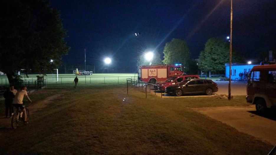 Lądowanie śmigłowca w warunkach nocnych ( z wykorzystanie oświetlenia stadionowego) było zakończeniem i podsumowaniem szkolenia dla strażaków.