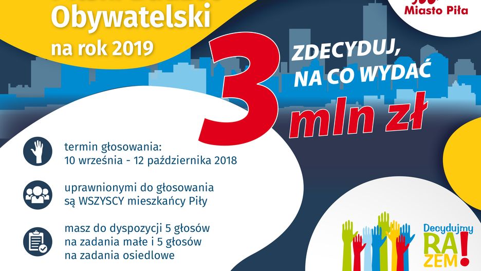 Zaczął się kolejny etap Pilskiego Budżetu Obywatelskiego – głosowanie, w którym mogą wziąć udział wszyscy pilanie. Ten etap potrwa do 12 października 2018r.. Spośród 191 propozycji – jakie dotarły do Urzędu Miasta – do dalszego etapu przeszło 119 zadań. Wśród zadań osiedlowych znalazły się 2 zadania wnioskowane przez Publiczne Przedszkole Nr 12: