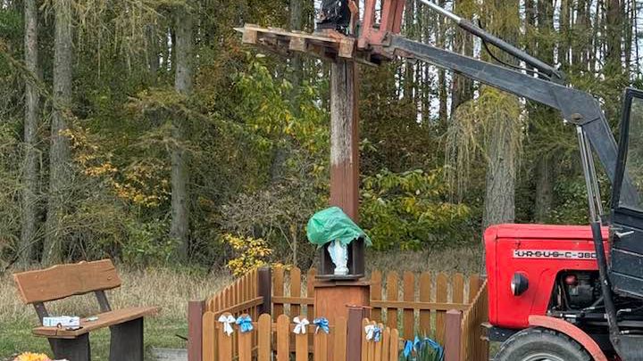 Radna Katarzyna Góra wraz z mieszkańcami i rodziną dzisiaj ciężko pracują odnawiając krzyż przydrożny w Wolsku.