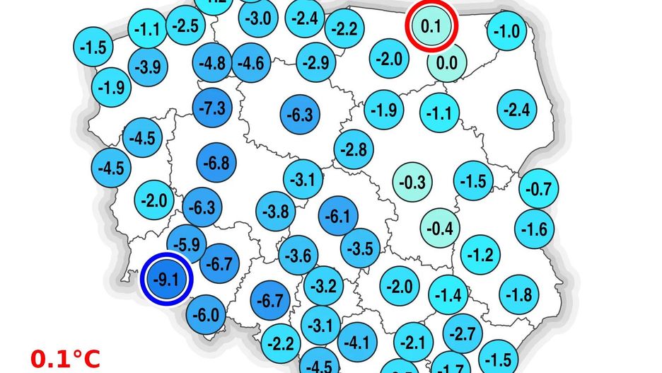 Prezentowane dane pochodzą ze stacji synoptycznych. Tej nocy najzimniej było w Jeleniej Górze ( -9,1 stopni Celsjusza ). Na drugim miejscu była Piła ( -7,3 stopni Celsjusza).