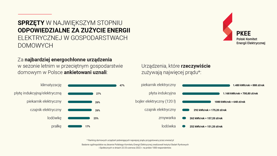Za najbardziej energochłonne urządzenie w przeciętnym gospodarstwie domowym Polacy uważają klimatyzację – wskazała na nią niemal połowa badanych (47 proc.). Na drugim miejscu znalazła się płyta indukcyjna/elektryczna (27 proc.). Ponadto aż 26 proc. ankietowanych za pobierające najwięcej prądu urządzenia uznało piekarnik i czajnik elektryczny. Co czwarty respondent wskazał lodówkę, a na kolejnych miejscach znalazła się m.in. pralka i suszarka do ubrań (po 17 proc.).