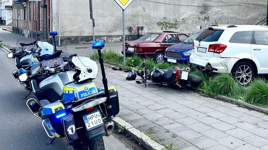 Podczas pościgu doszło do niebezpiecznego incydentu – na jednym z przejść dla pieszych motocyklista omal nie potrącił przechodnia, który w ostatniej chwili zdołał odskoczyć. Ucieczka zakończyła się po kilkuset metrach – kierowca stracił panowanie nad pojazdem, wjechał na chodnik i uderzył w dwa zaparkowane samochody.