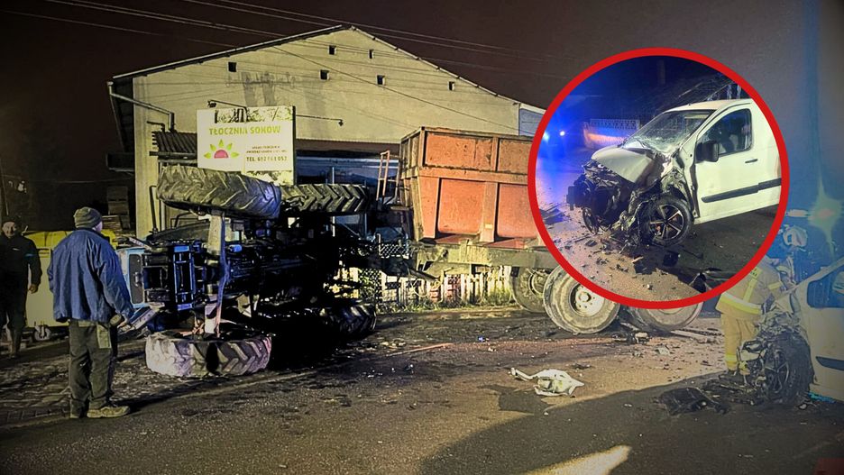 Do wypadku doszło kilka minut przed godz. 17.00. Doszło tam do zderzenia busa z ciągnikiem z naczepą. Siła uderzenia była tak duża, że ciągnik przewrócił się na bok. Kierowca busa odniósł obrażenia ciała i został przetransportowany do szpitala.