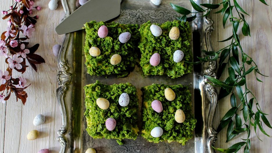z cukrem na jasną i puszystą masę. Ubijając powoli wlewać olej. Dodać szpinak, a następnie przesianą mąkę z proszkiem do pieczenia. Mieszać do połączenia się składników. Ciasto wylać do wyłożonej papierem formy. Piec około 50 minut w piekarniku nagrzanym do 180 stopni C. Wyjąć z piekarnika i odstawić do całkowitego ostygnięcia. Do misy miksera wlać schłodzoną śmietanę kremówkę i ubić ją na sztywno. Pod koniec miksowania dodać cukier puder i wanilię. Następnie stopniowo dodawać serek mascarpone. Ubijać, aż masy połączą się w puszysty krem. Wystudzone ciasto przekroić na 2 blaty i odciąć z wierzchu „górkę”, która posłuży jako dekoracyjny mech. Na dolny blat wyłożyć połowę kremu, następnie drugi blat i resztę kremu. Wierzch posypać pokruszonym ciastem i udekorować np. czekoladowymi jajkami.