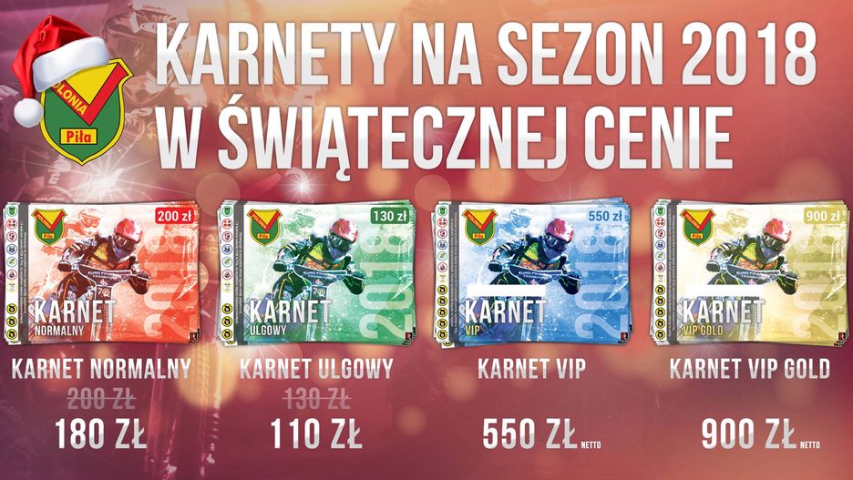Jak co roku tuż przed Świętami Bożego Narodzenia rusza ze sprzedaż karnetów na nadchodzący żużlowy sezon. Wejściówki będzie można nabyć od najbliższego poniedziałku – 18 grudnia wyłącznie w siedzibie klubu. Do świąt karnety sprzedawane będą w promocyjnych cenach. Zarząd tym samym ustalił również ceny biletów na sezon 2018.