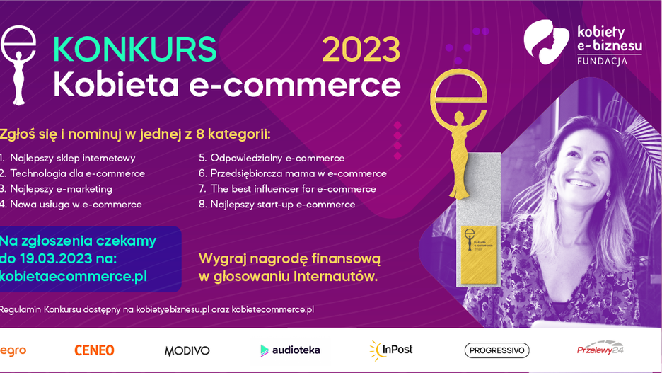 Ruszyły nominacje i zgłoszenia kandydatek do II edycji konkursu Kobieta e-commerce 2023, organizowanego przez Fundację Kobiety e-Biznesu wraz z Partnerami. Konkurs nagradza kobiece start-upy oraz przedsiębiorczość kobiet, które realizują innowacyjne projekty rozwijając tym branżę biznesu prowadzonego głównie online. Na zgłoszenia organizatorzy czekają do 19 marca 2023 r.