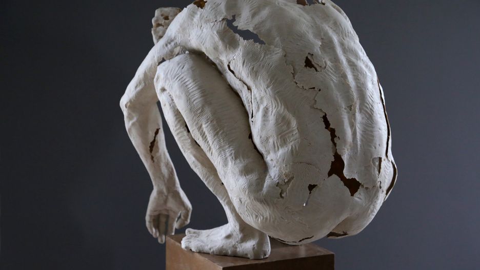 Pusta przestrzeń stanowi intrygującą część kilku rzeźb Boguckiego. Techniczna precyzja i niemal klasyczna doskonałość aktu mężczyzny skulonego, jakby poszukującego równowagi i nieznanego nam punktu oparcia, kieruje naszą uwagę właśnie ku klasycznej harmonii. Ale nie anatomiczna doskonałość jest sensem tego aktu, znajduję go właśnie w pustce otwartej struktury, która pokazując byt zewnętrzny, wskazuje jednocześnie to co wewnętrzne, trudne i niezidentyfikowane. Można by zaryzykować stwierdzenie że artysta równocześnie w jakimś holistycznym geście pokazuje równoległy obraz pozytywu i negatywu.