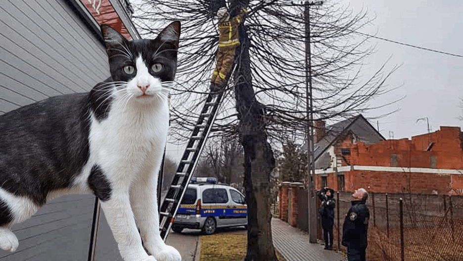 Dzielni strażacy zabrali kotka na ziemię. Był przestraszony i wychłodzony, ale na dole był już zadowolony.