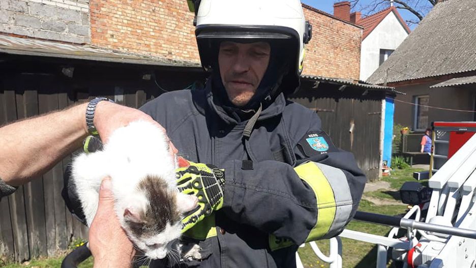 W Wielki Piątek strażacy z OSP w Margoninie uratowali małego kotka, który wszedł na dach budynku i nie mógł zejść o własnych siłach.