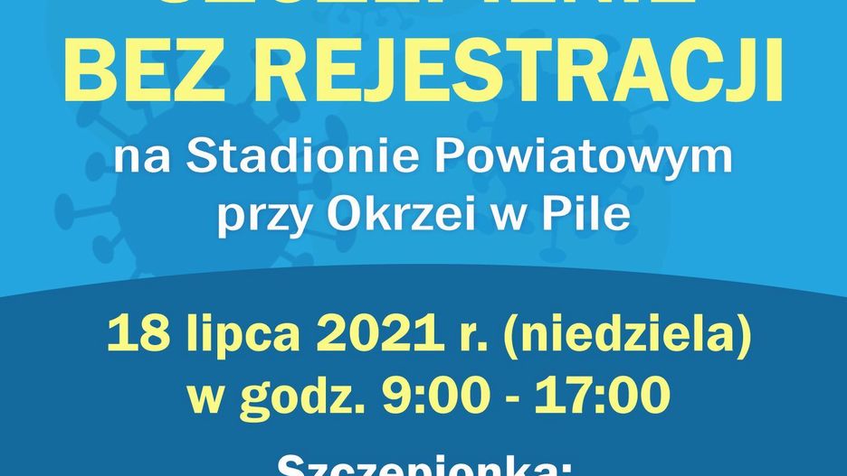 W najbliższą niedzielę, 18 lipca, w godzinach 9:00-17:00 na Stadionie Powiatowym w Pile będzie możliwość́ zaszczepienia się przeciw COVID-19, BEZ KONIECZNOŚCI REJESTRACJI!
