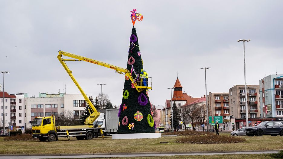 W sobotę od rana trwa montaż nowego wystroju świątecznego miejskiej choinki położonej u zbiegu ul. Bydgoskiej, Al. Powstańców Wielkopolskich i al. Jana Pawła II.