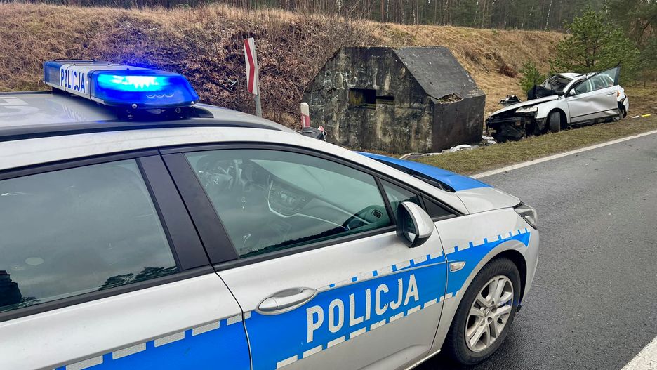 Ze wstępnych ustaleń wynika, że kierujący samochodem marki VW z nieznanej dotąd przyczyny zjechał z drogi do przydrożnego rowu, a następnie uderzył w betonowy bunkier.Dwie osoby (kierujący oraz pasażerka) zostali zabrani do szpitala w stanie ciężkim. Na miejscu pracują policjanci.Droga jest zablokowana.