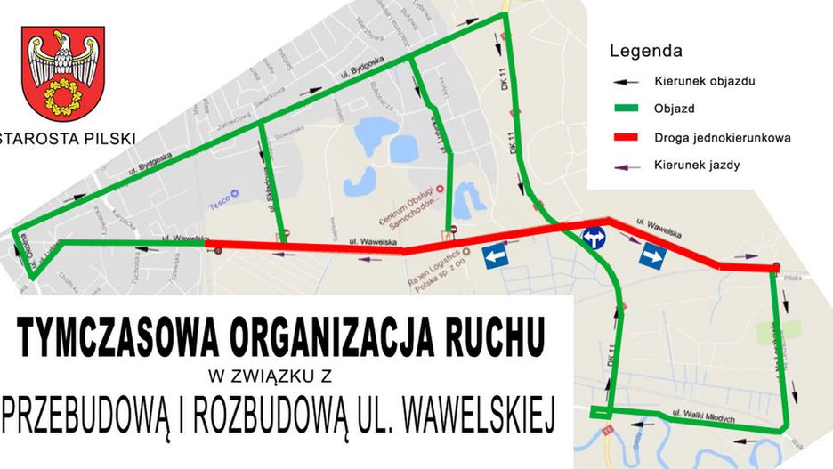 Na czas prac przy Wawelskiej ulica ta zmieni się w jedno kierunkową od łącznicy zjazdowej z drogi krajowej nr 11. Kierujący pojazdami, którzy będą chcieli dostać się do Centrum Piły lub z powrotem na ulicę Wawelską muszą skorzystać z objazdu do ulicy Okólnej przez ul. Bydgoską. Niemożliwy będzie wjazd do Piły przez ul. Wawelską od Gminy Kaczory. Tutaj wykonawca przewidział objazd kolejno przez Leszków, ul. Walki Młodych oraz drogę krajową 11, aż do łącznicy zjazdowej DK11. Ruch w stronę centrum Piły odbywać się będzie po prawej stronie jezdni, natomiast w stronę Leszkowa i Gminy Kaczory po stronie lewej jezdni.