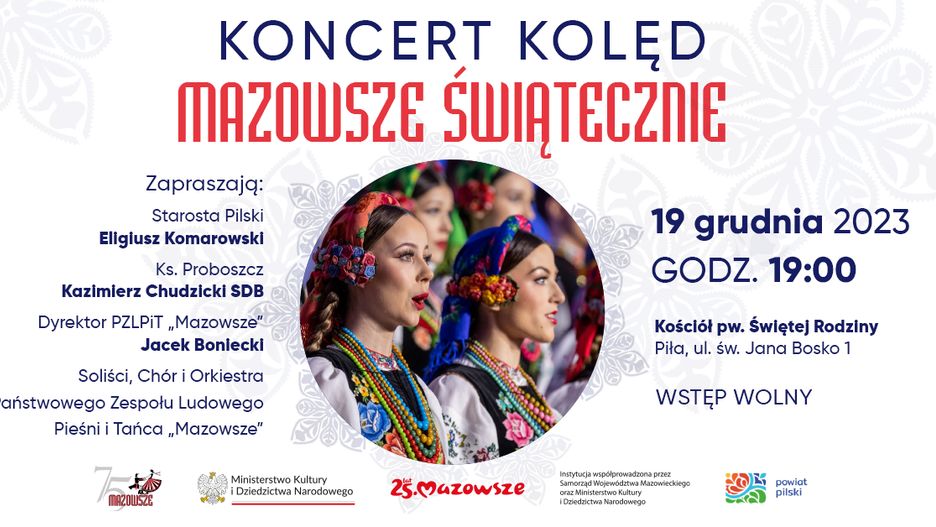 Na koncert zapraszają starosta pilski Eligiusz Komarowski, proboszcz parafii pw. Świętej Rodziny w Pile ks. Kazimierz Chudzicki SDB oraz dyrektor Państwowego Zespołu Ludowego Pieśni i Tańca „Mazowsze” Jacek Boniecki.