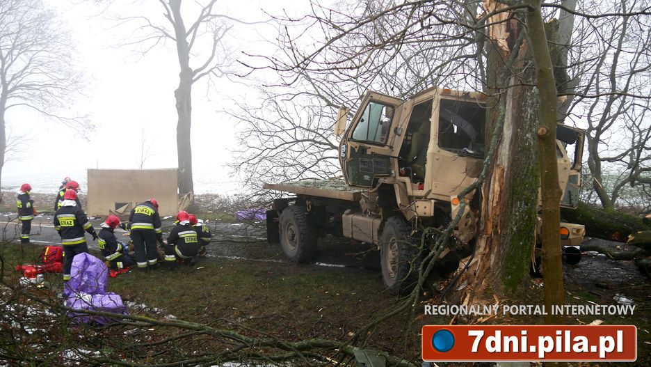Do zdarzenia doszło na prostym odcinku drogi 179. Pojazd wojskowy uderzył w drzewo. Podróżowało w nim trzech żołnierzy amerykańskich. Dwóch z nich zostało zakleszczonych. Strażacy musieli wycinać ich z pojazdu. Ranni trafili do szpitala w Pile.